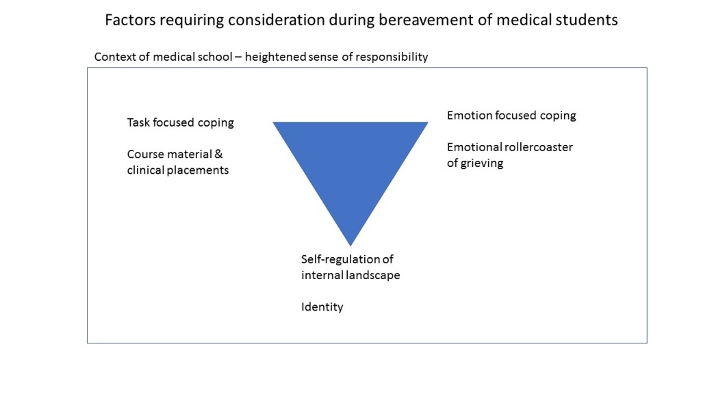 Specifically, given that students are embedded in a demanding university course, there is a tension or dilemma between whether to take a break and care for their loved one or to grieve; and whether or not to carry on with course albeit perhaps with provisions to help cope; or at least have an understanding of the rollercoaster of emotions students will go through and which may be triggered by the course material, clinical placements and/or patients and their families. That is, when studying medicine, students are embedded in the very field that their loved one may be entering and then leaving permanently. There is every chance that medical students will come across material and patients that will remind them of their loved one. If the experience is not processed, this may mean that students suffer later on in an accumulation or outpouring of grief or a frantic repression at all costs. What follows are some descriptions of the more subtle aspects that do not always get spoken about of the experience of loss whilst at medical school.