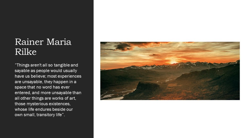 Suffering itself is described as wordlessness, loss and seeing yourself on the wrong side of an abyss that separates you from life13. The experience of suffering can seem as misty or intangible or unsayable. Making use of words, images and poems to write a letter or draw a picture or reflect on an image that has meaning for you are all ways to make connections between your experiences which can help process the grief and restore you to yourself. By restoring aspects of your experience, you are starting up a conversation with yourself about your loss and suffering. This is important because when we lose someone we can become paralyzed by that loss as we lose our habitual ways of going about our life and as yet have nothing to replace them. The sense of losing our internal maps, as represented by the other person, can be a source of distress as they are our guide to being in the world. With time we will put together a map that can encompass the loss.